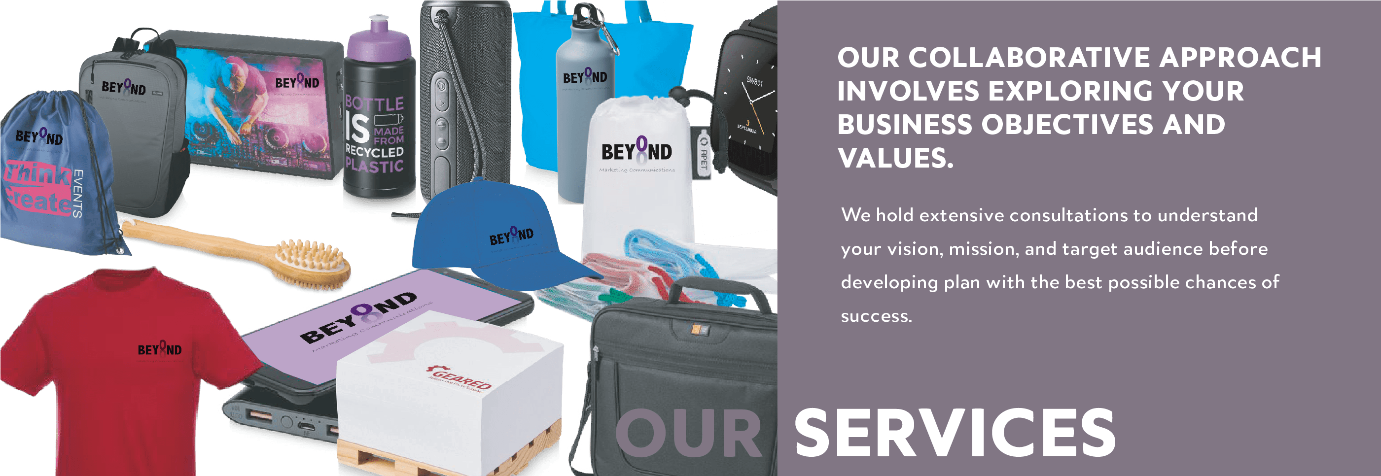 From branded apparel and accessories to custom giveaways and corporate gifts, we present an extensive range of promotional items that serves as a dynamic extension of your brand. By curating tailor-made items that seamlessly integrate with your brand image, these items boost visibility, inspire customer loyalty, and present tangible reminders of your brand in everyday life.